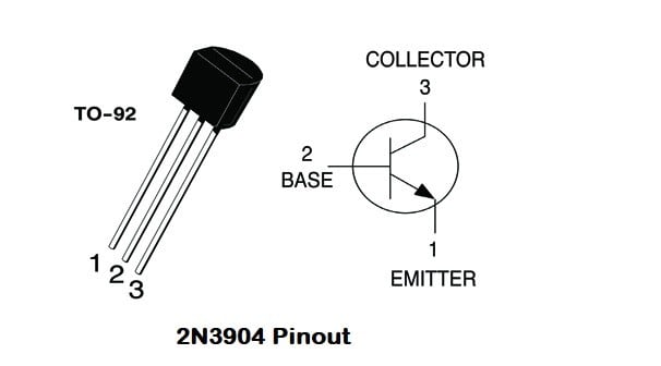 It all centers around a 2N3904 transistor, labelled here “Q1”. Just search your local electronics parts store for one of these. This picture explains how you identify the legs
